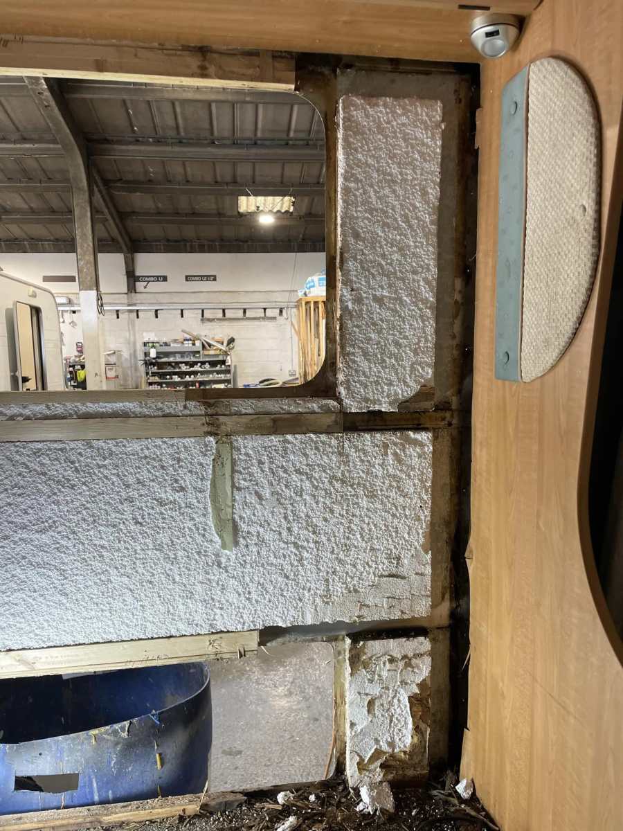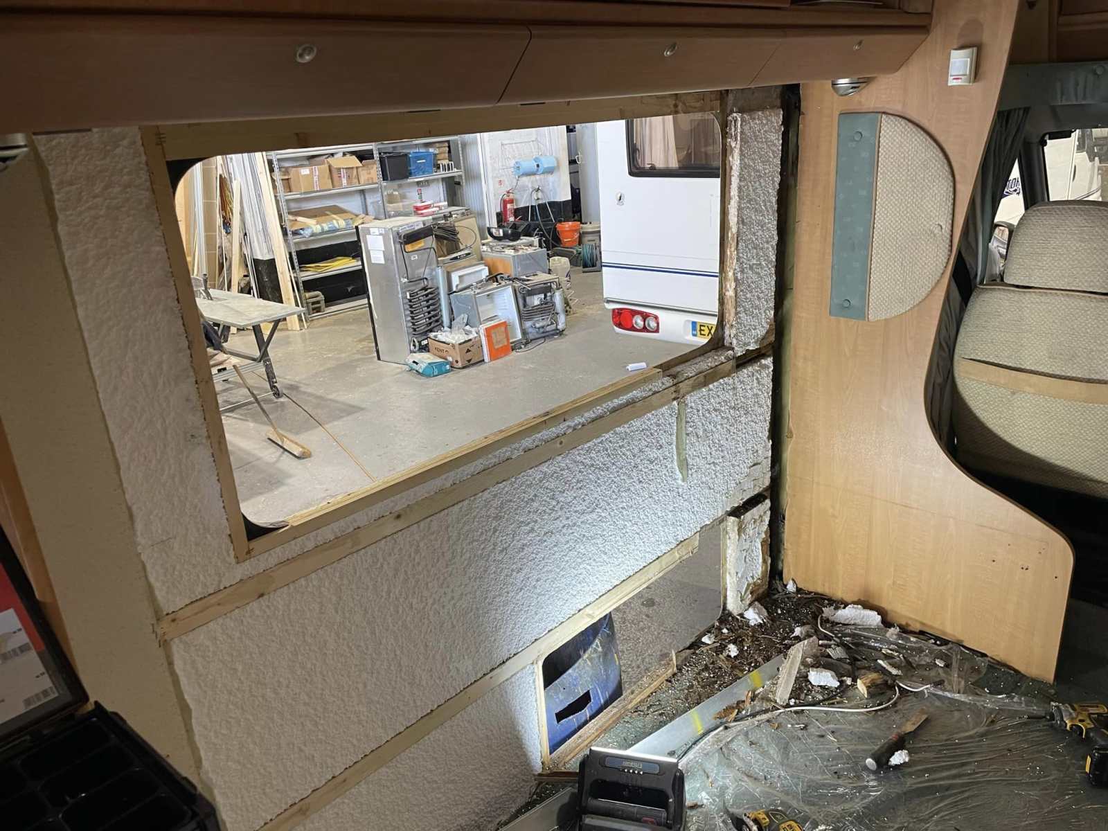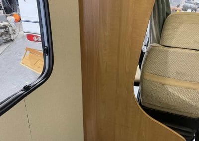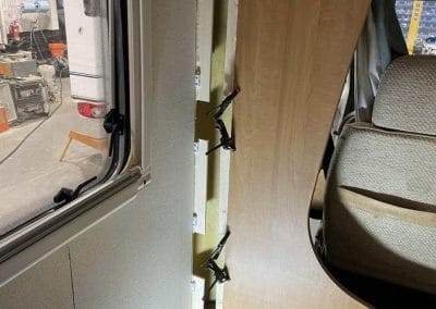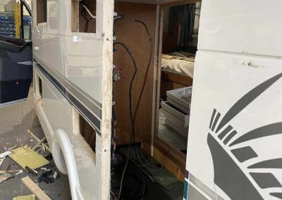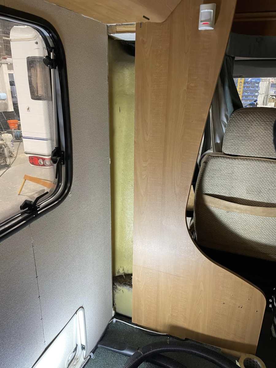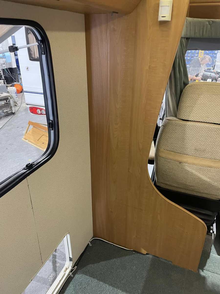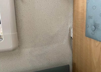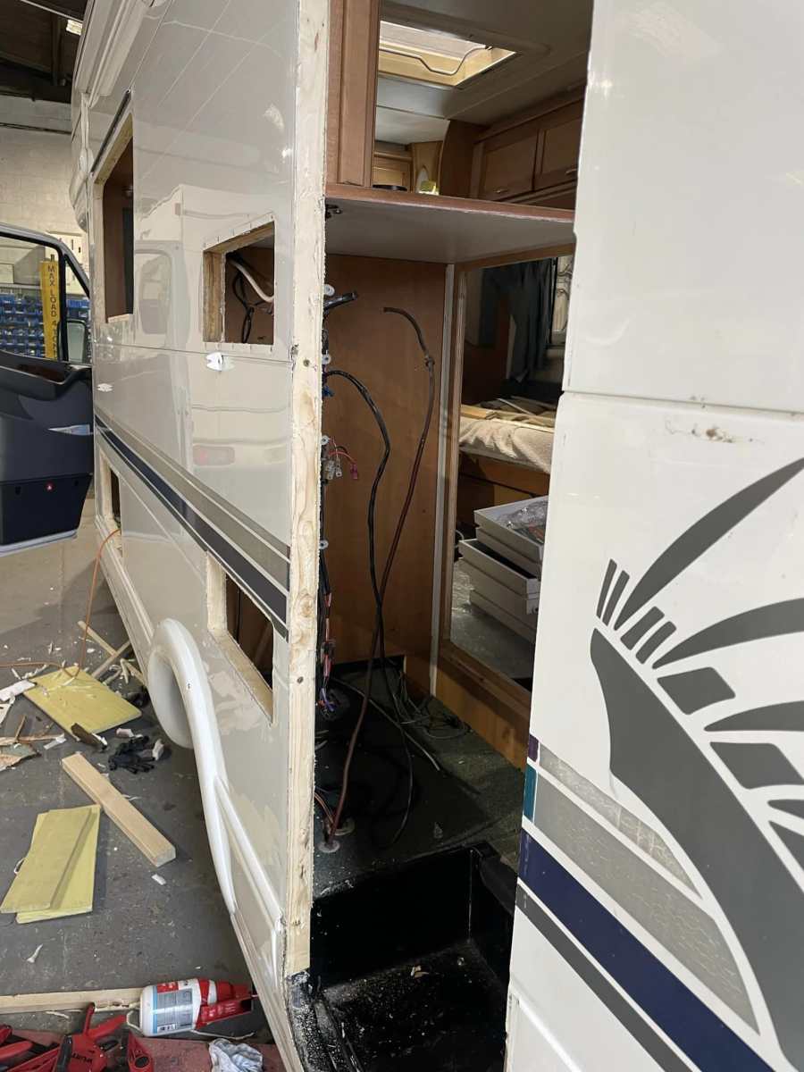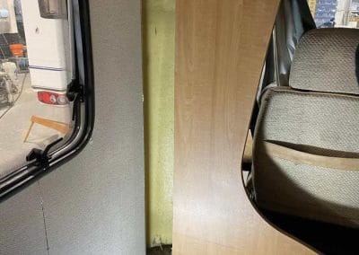 Unfortunately the owner of this vehicle was not aware of the damp until they brought it in for a totally unrelated repair and our engineer noticed the problem. We made our customer aware and they asked for the work to be carried out. It involved quite a lot of work from removing the off side skirts and cleaning sealant off of the skirts and vehicle, removing the internal bed boxes on both sides, removing the outer awning rail, external locker door and frame, all damaged wall boards and timbers and replacing with new and refitting on new sealant where required, then the interior could be put back together.