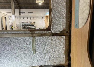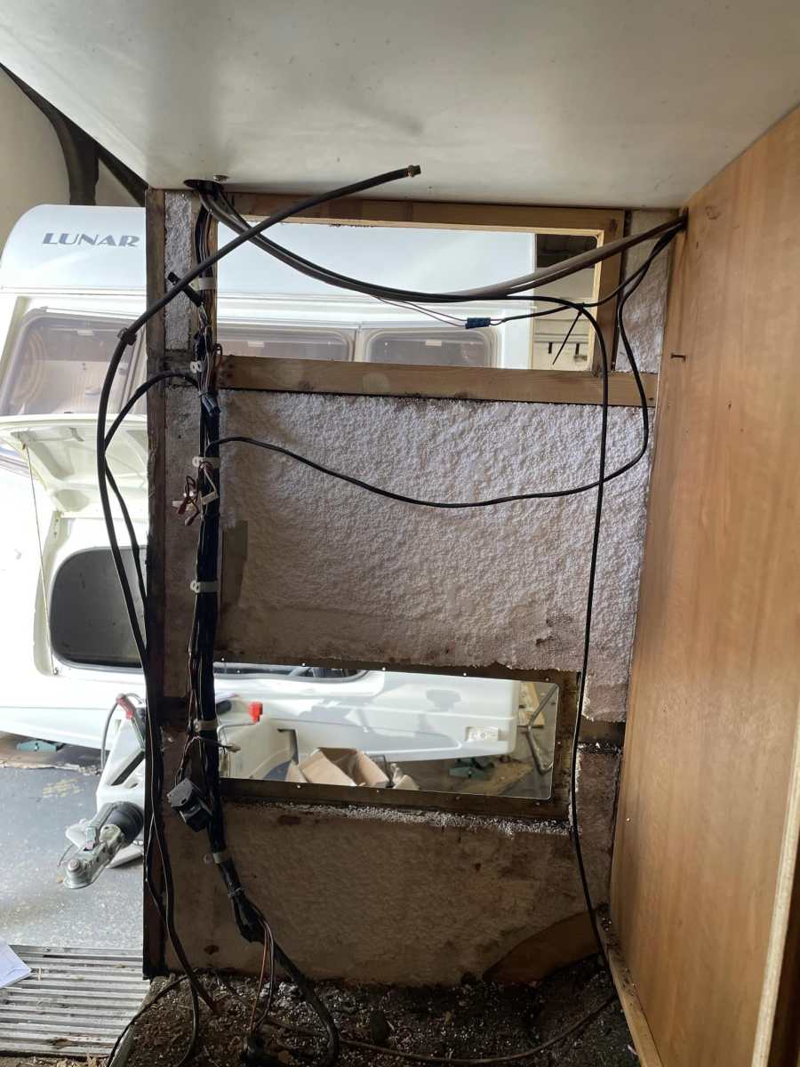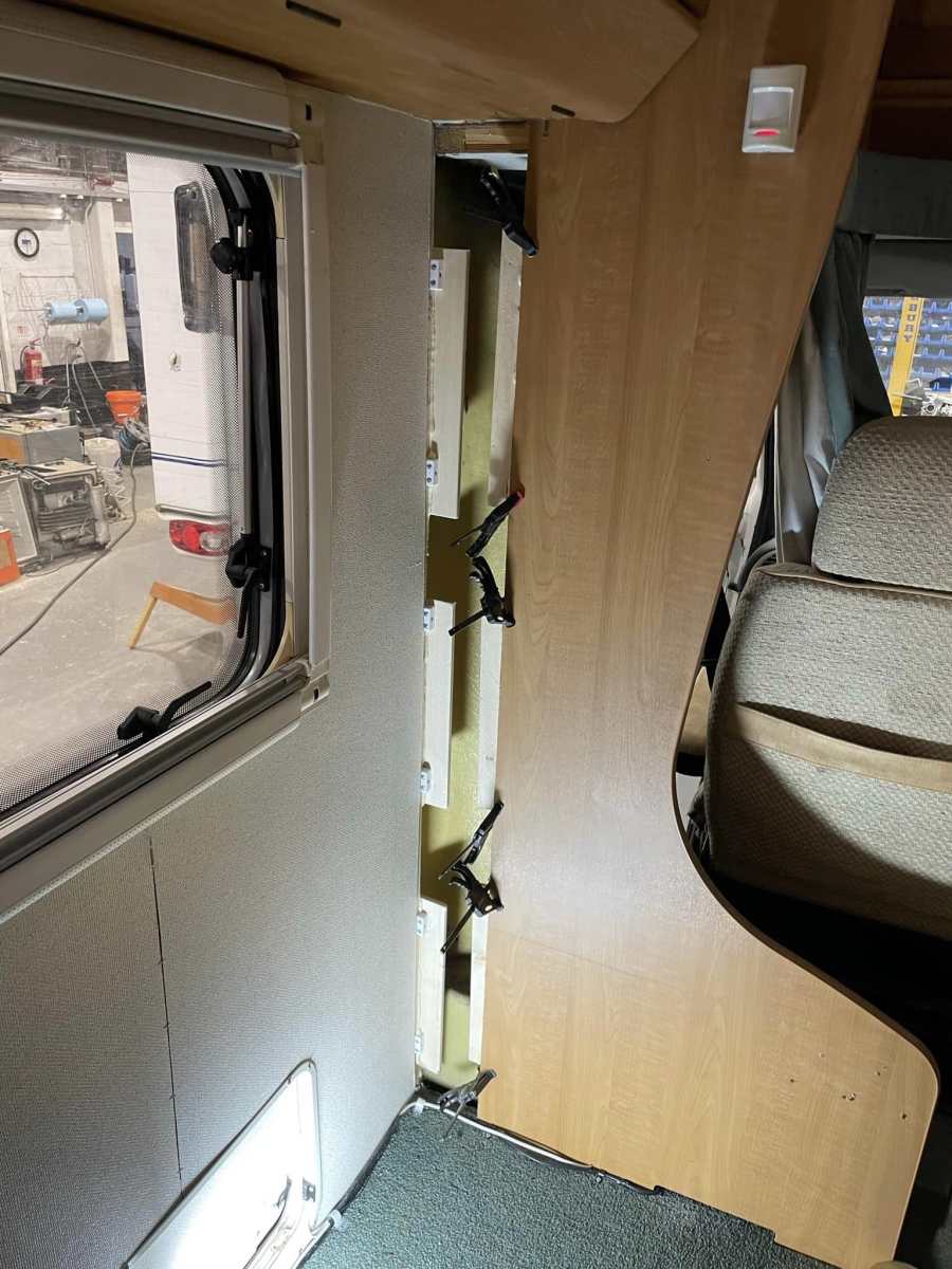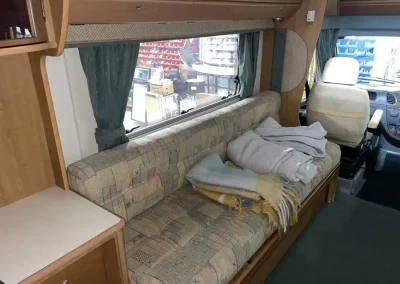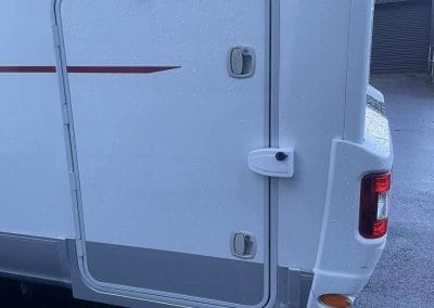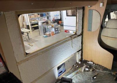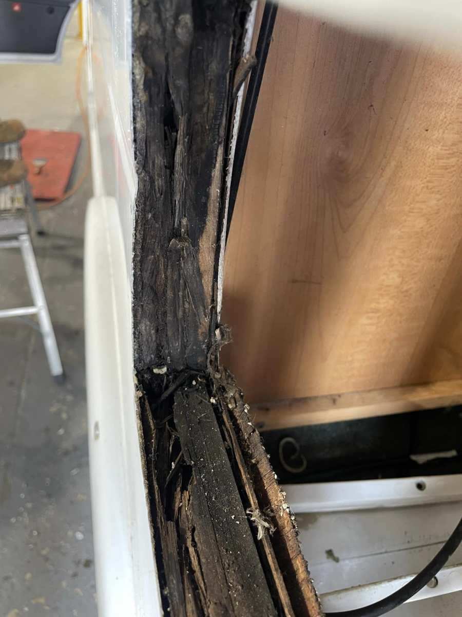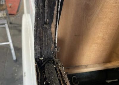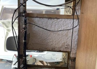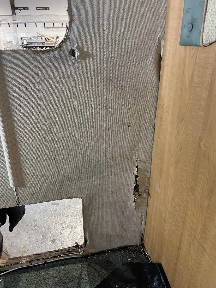 Unfortunately the owner of this vehicle was not aware of the damp until they brought it in for a totally unrelated repair and our engineer noticed the problem. We made our customer aware and they asked for the work to be carried out. It involved quite a lot of work from removing the off side skirts and cleaning sealant off of the skirts and vehicle, removing the internal bed boxes on both sides, removing the outer awning rail, external locker door and frame, all damaged wall boards and timbers and replacing with new and refitting on new sealant where required, then the interior could be put back together.